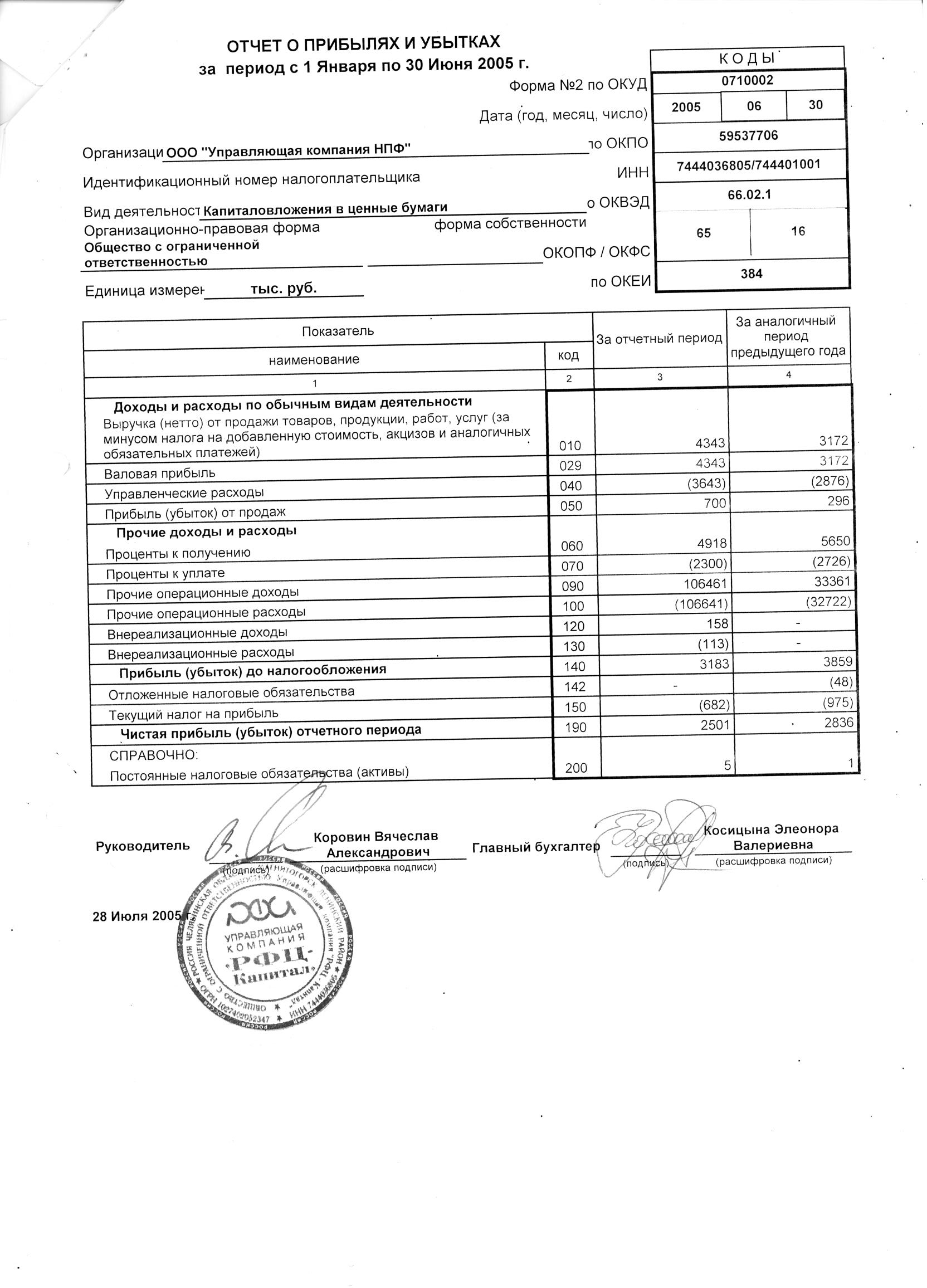 - Отчет о прибылях и убытках ООО УК РФЦ-Капитал за полугодие